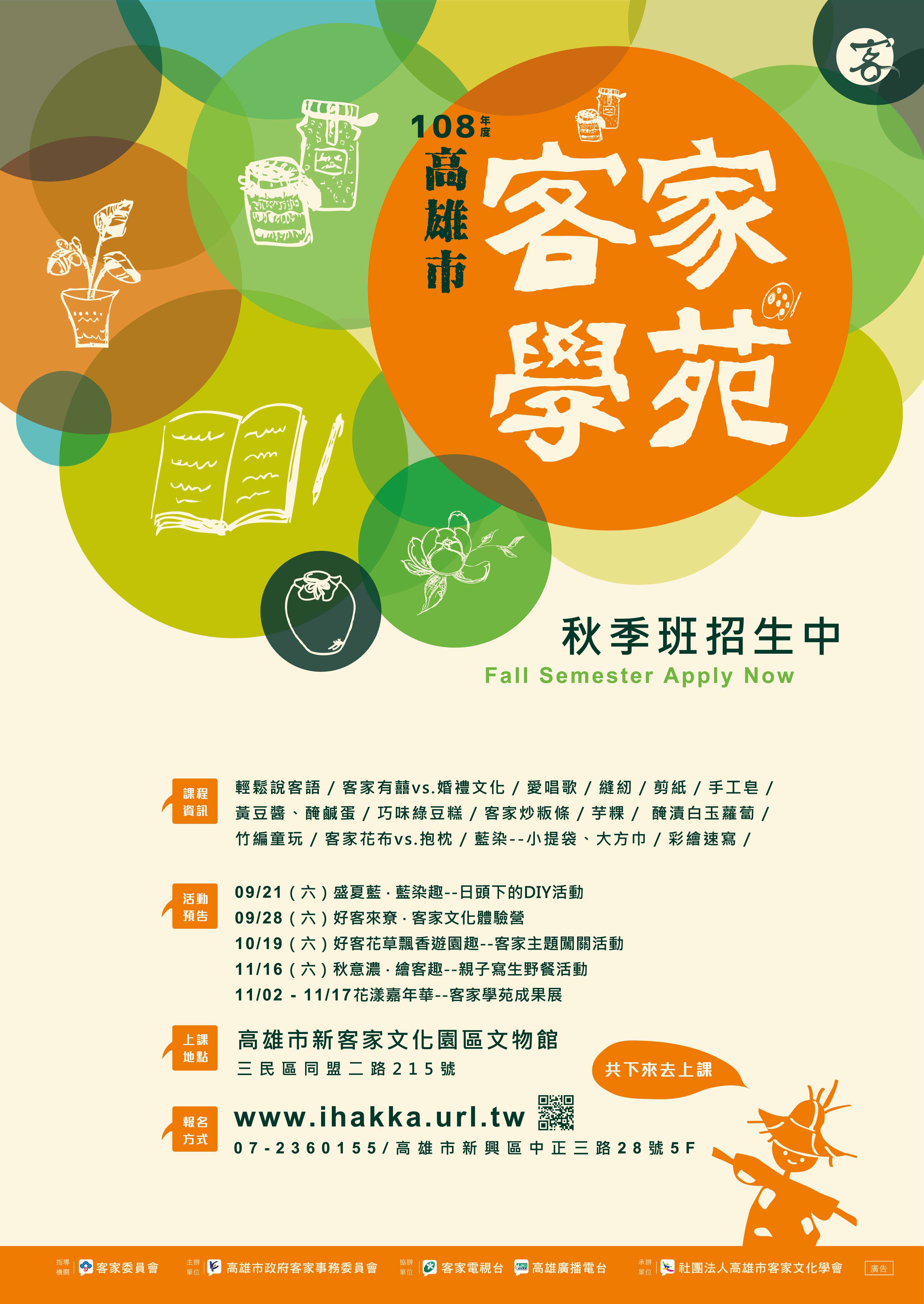 本課程及報名資訊可至高雄市客家學苑網站(http://www.ihakka.url.tw)、臉書「高雄市客家學苑」查詢,或洽報名專線:(07)2360155。