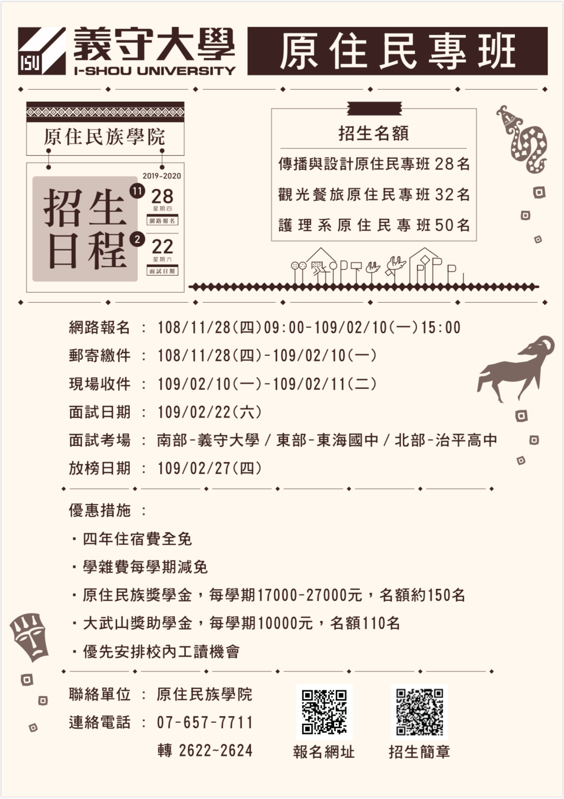 (五)聯絡方式:07-6577711轉2134(招生組)2622-24(原民學院)