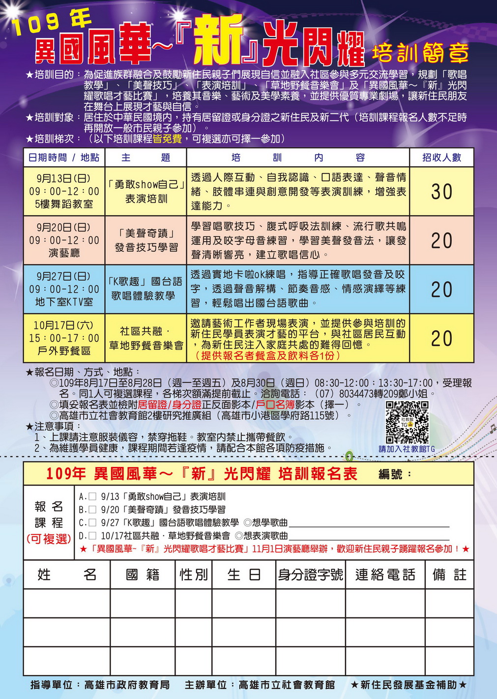 | 2020/07/29 高雄市立社會教育館為鼓勵新住民親子們展現自信並融入社區參與多元交流學習,本館舉辦「異國風華─『新』光閃耀培訓」,有表演培訓、美聲技巧、歌唱教學、草地野餐音樂會等免費課程,增進其音樂、藝術及美學素養,敬請協助宣傳廣為周知, |