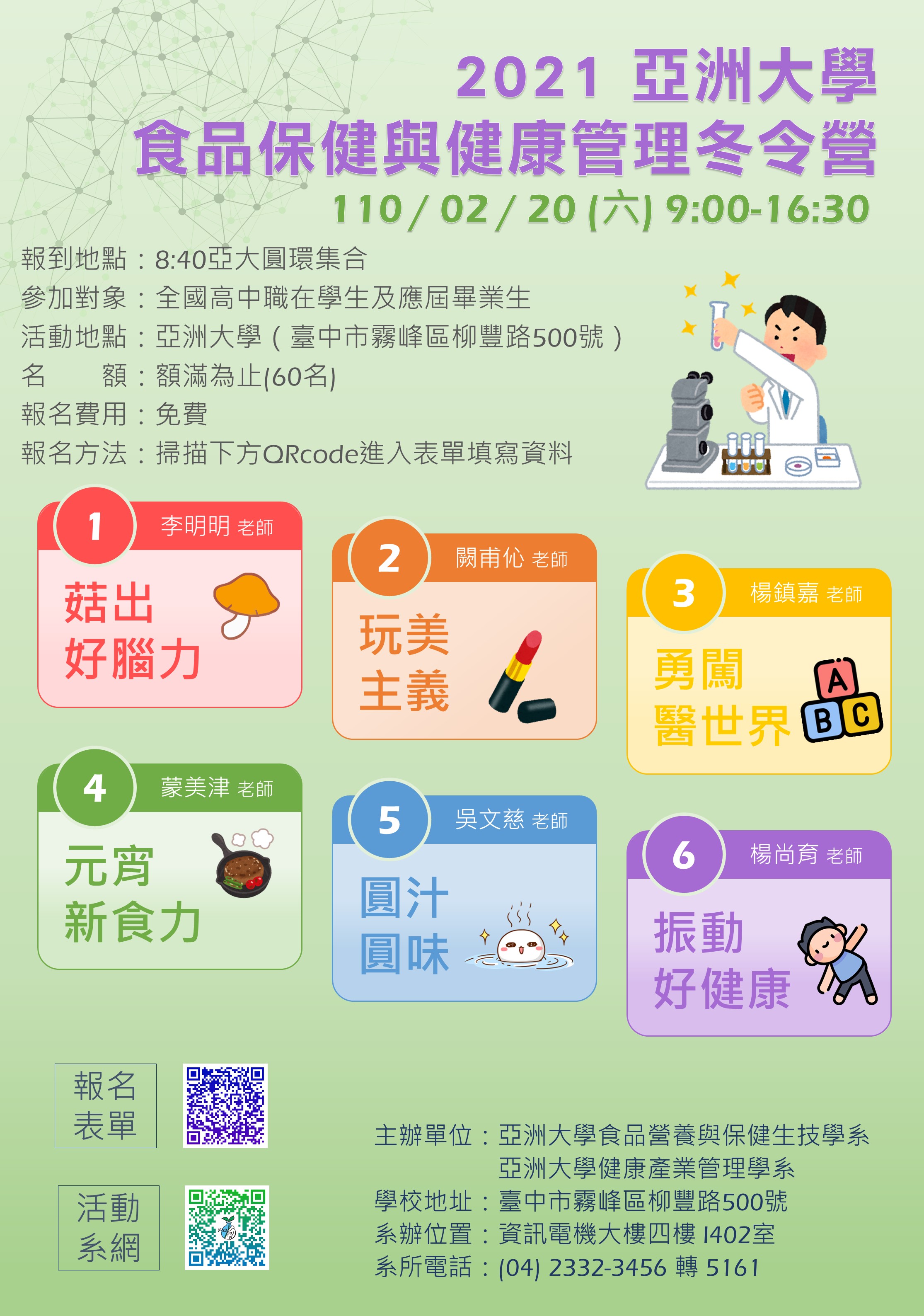 | 2021/01/15 亞洲大學食品營養與保健生技學系舉辦「2021亞洲大學食品保健與健康管理冬令營」,敬請惠予公告並鼓勵貴校學生踴躍報名參加 |