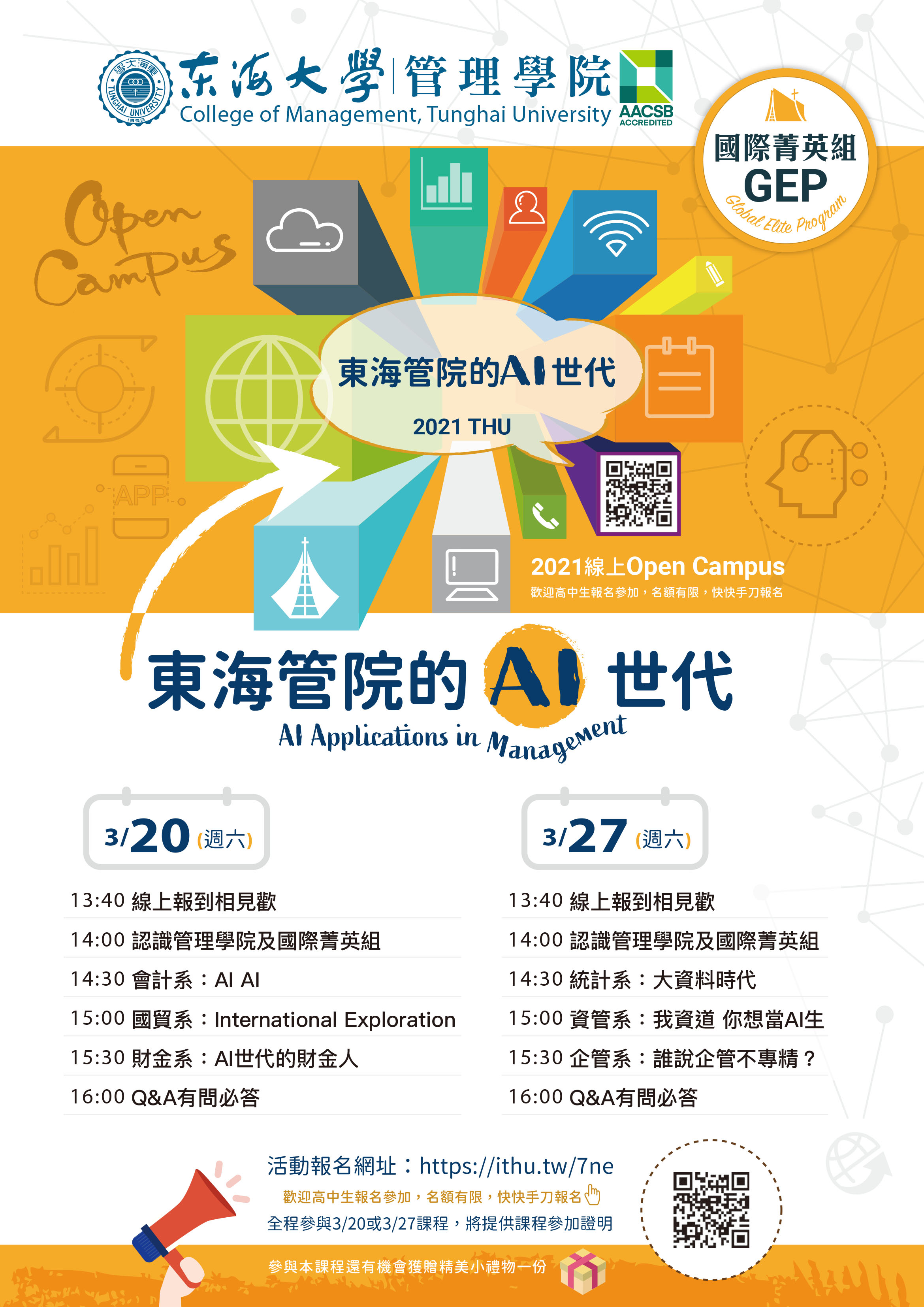(一)活動名稱:「2021年線上Open Campus:東海管院的AI世代」,活動詳情請參閱海報,如附件。