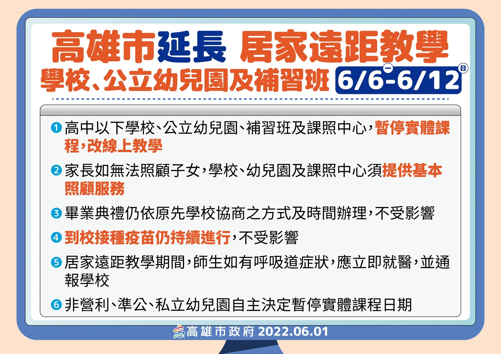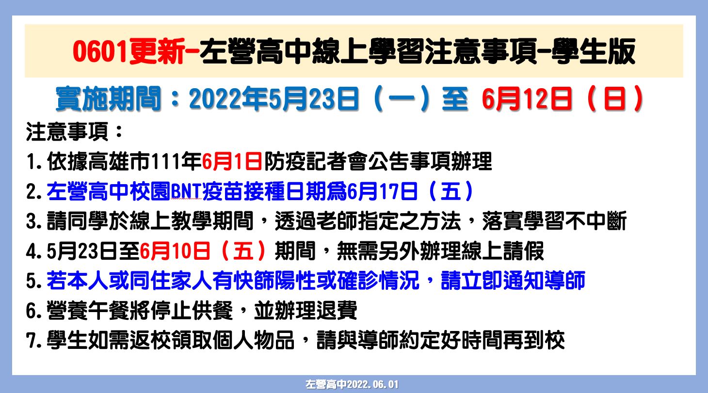 1.依據高雄市111年6月1日防疫記者會公告事項辦理。