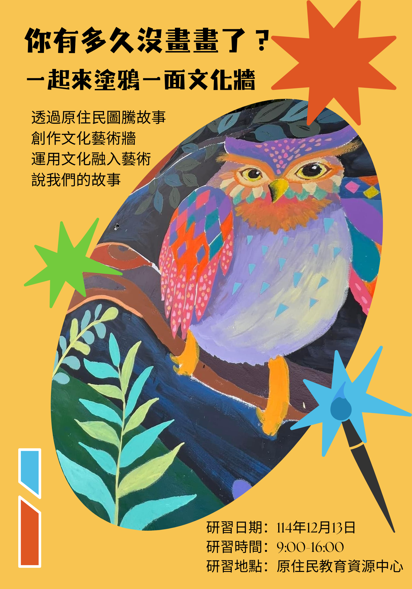 | 2025/11/19 高雄市政府教育局 【原住民族教育資源中心辦理「文化融入藝術增能研習─你有多久沒畫畫了?」】 |