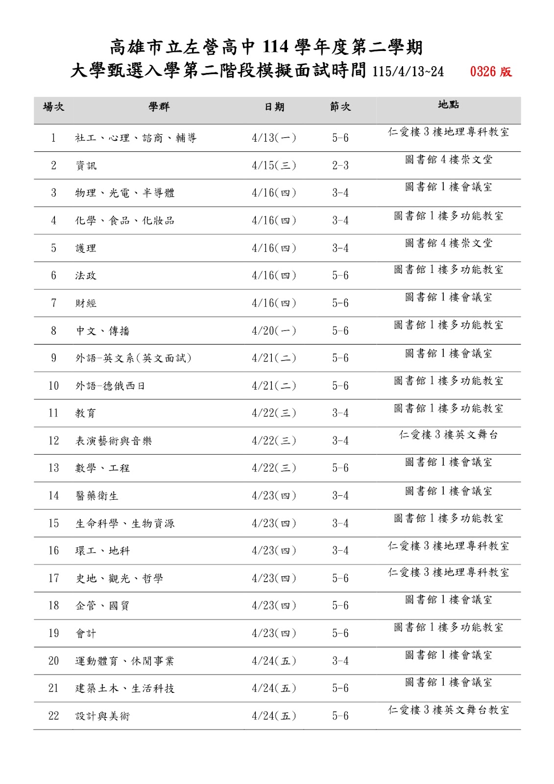2.高三個人申請模擬面試於4/13~24預計辦理22場,場次表如附件。可以報名多個場次,若同時段有場次衝突,輔導室會進行協調;不確定學系隸屬哪個場次,可以在表單留言或親洽輔導室。
