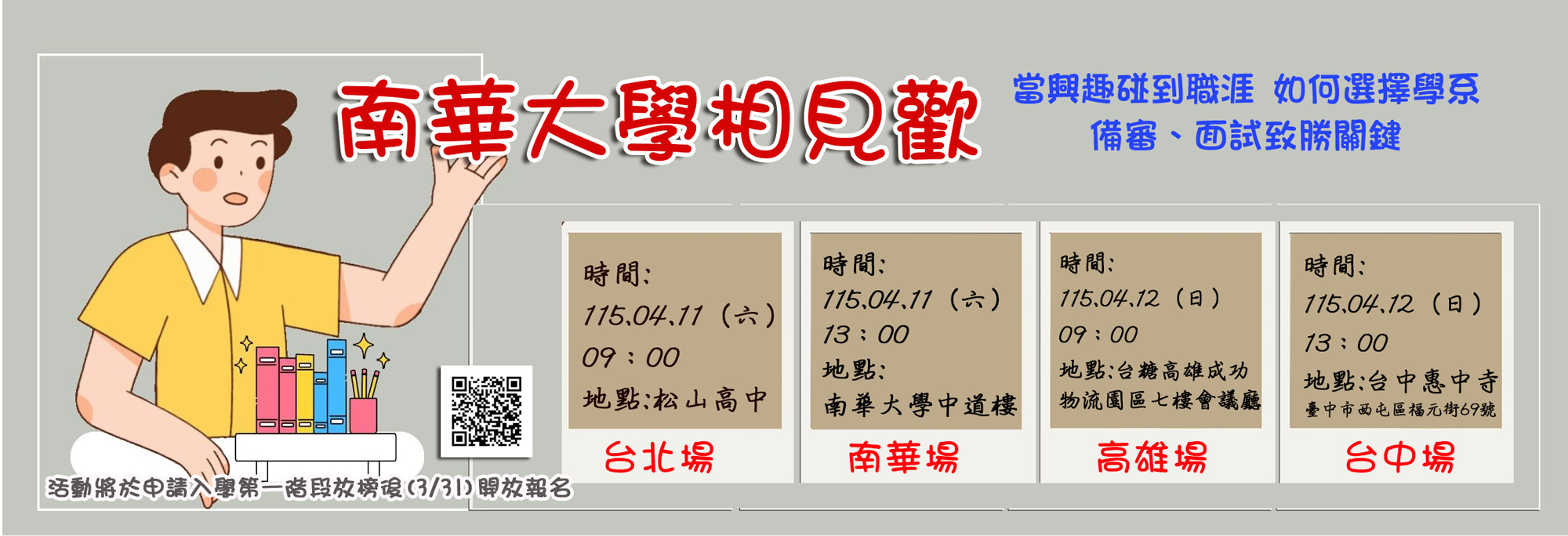 | 2026/03/28 4/12「南華大學相見歡」活動於台糖成功高雄物流園區,歡迎家長同學報名參加 |