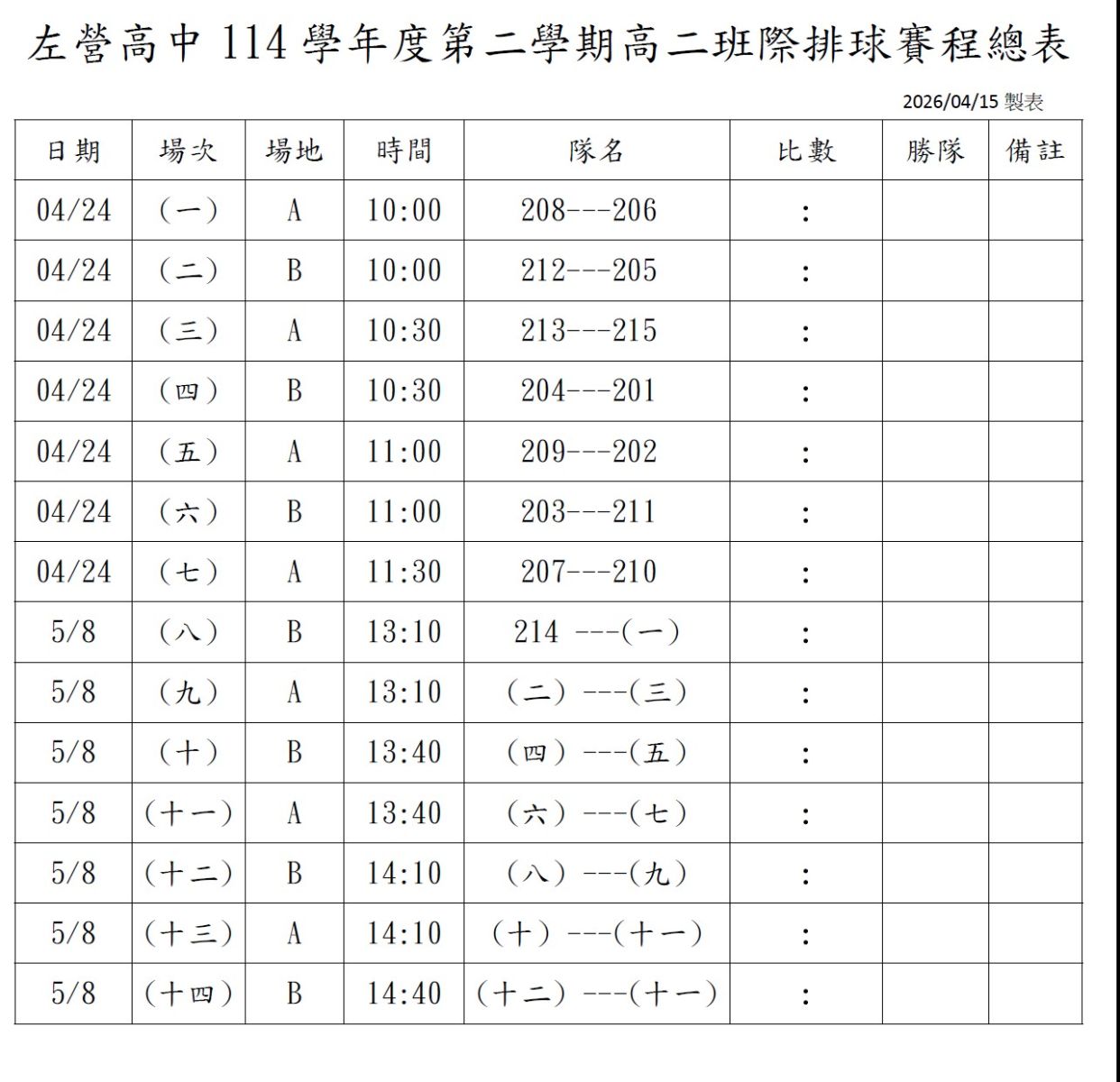⚠️注意事項:1.表訂時間為比賽時間,請各班‘’務必‘’提早10分鐘下來做暖身及檢錄。2.請攜帶學生證(或其他附有相片‘能確認’其本人身分之證件)供大會核實身分。3.比賽時間到,現場唱名班級三次,未出現則取消參賽資格。4.比賽會穿著號碼衣。