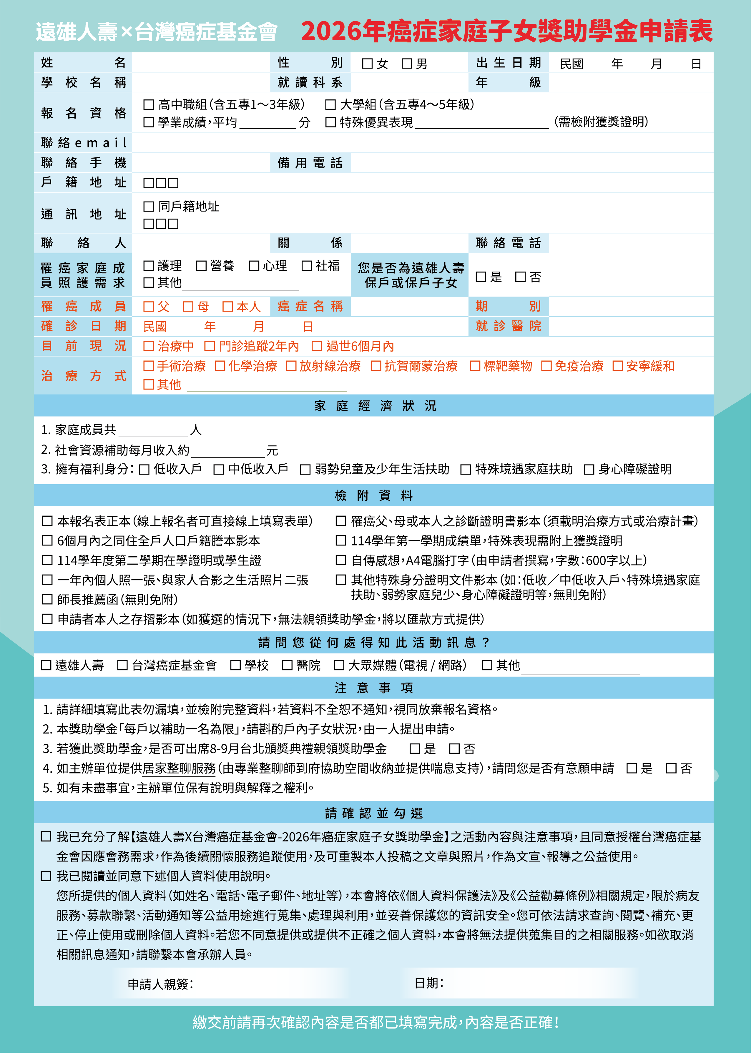 | 2026/04/23 財團法人臺灣癌症基金會(以下簡稱癌症基金會)「2026台灣癌症基金會x遠雄人壽-癌症家庭子女獎助學金」申請事宜 |