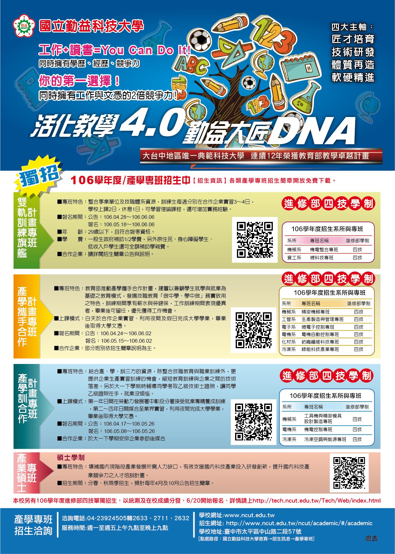 | 2017/05/23 國立勤益科技大學106學年度進修部四技「雙軌訓練旗艦計畫專班」單獨招生訊息 |
