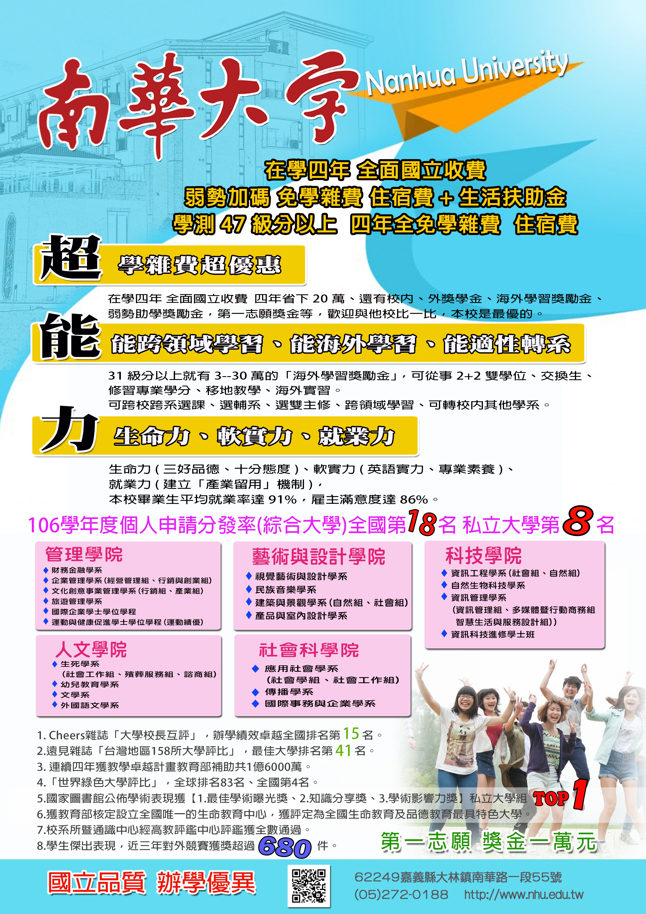 一、本校國立品質、國立收費+多項獎金,承蒙貴校的支持,106學年度個人申請分發率(綜合大學)全國排名第18名、私立大學排名第8名。