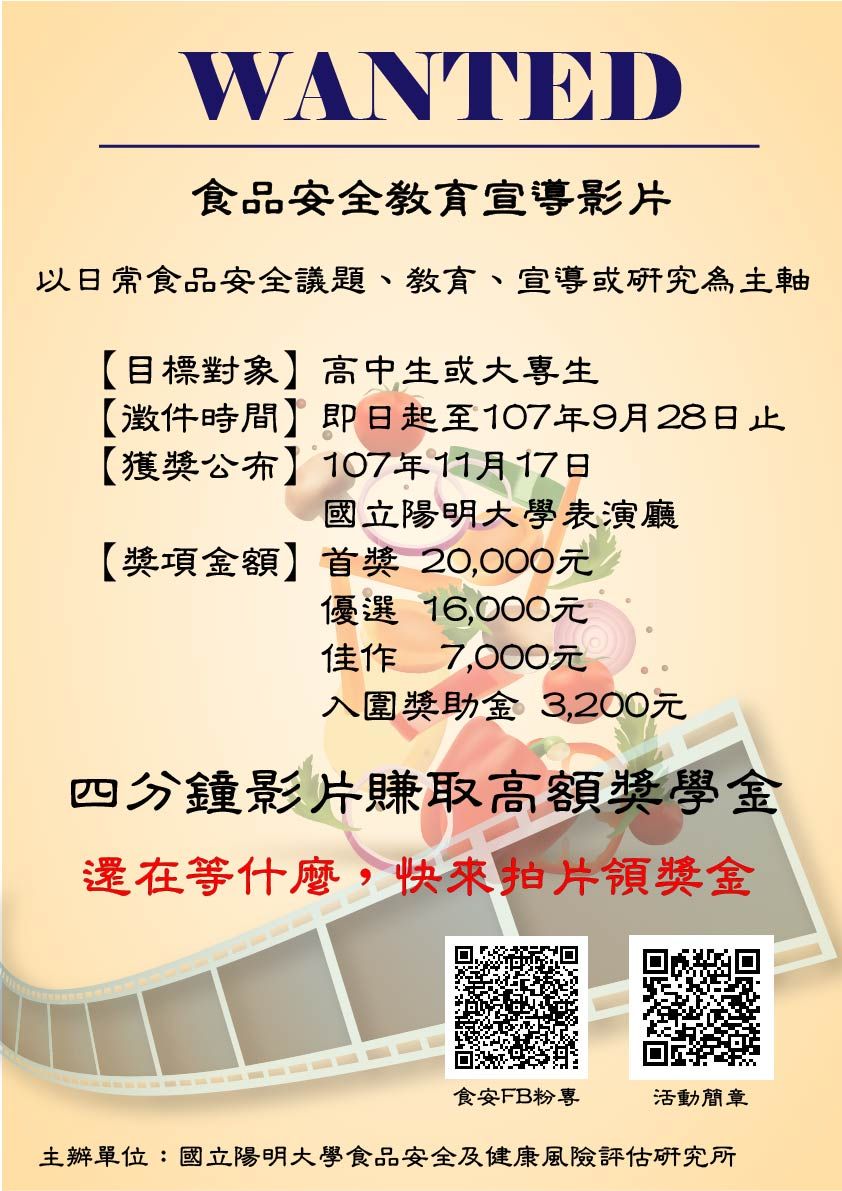 一、為增進食品安全教育宣導與交流,以及促使莘莘學子對食品安全認知的重視,特舉辦本次競賽活動,邀請大專院校及高中職學生從日常食品安全議題、教育、宣導或研究為主軸製成影片,投稿參賽。
