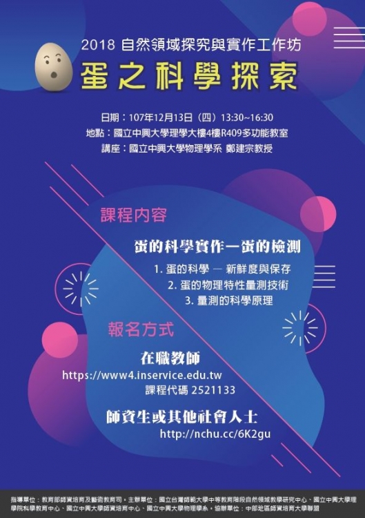 國立中興大學本校師資培育中心擬訂於107年12月13日舉辦「2018自然領域探究與實作工作坊」蛋的科學實作-蛋的檢測,活動海報及報名網址如說明,敬請協助公告,並轉知所屬教師踴躍參加且核予公、差假,請查照。