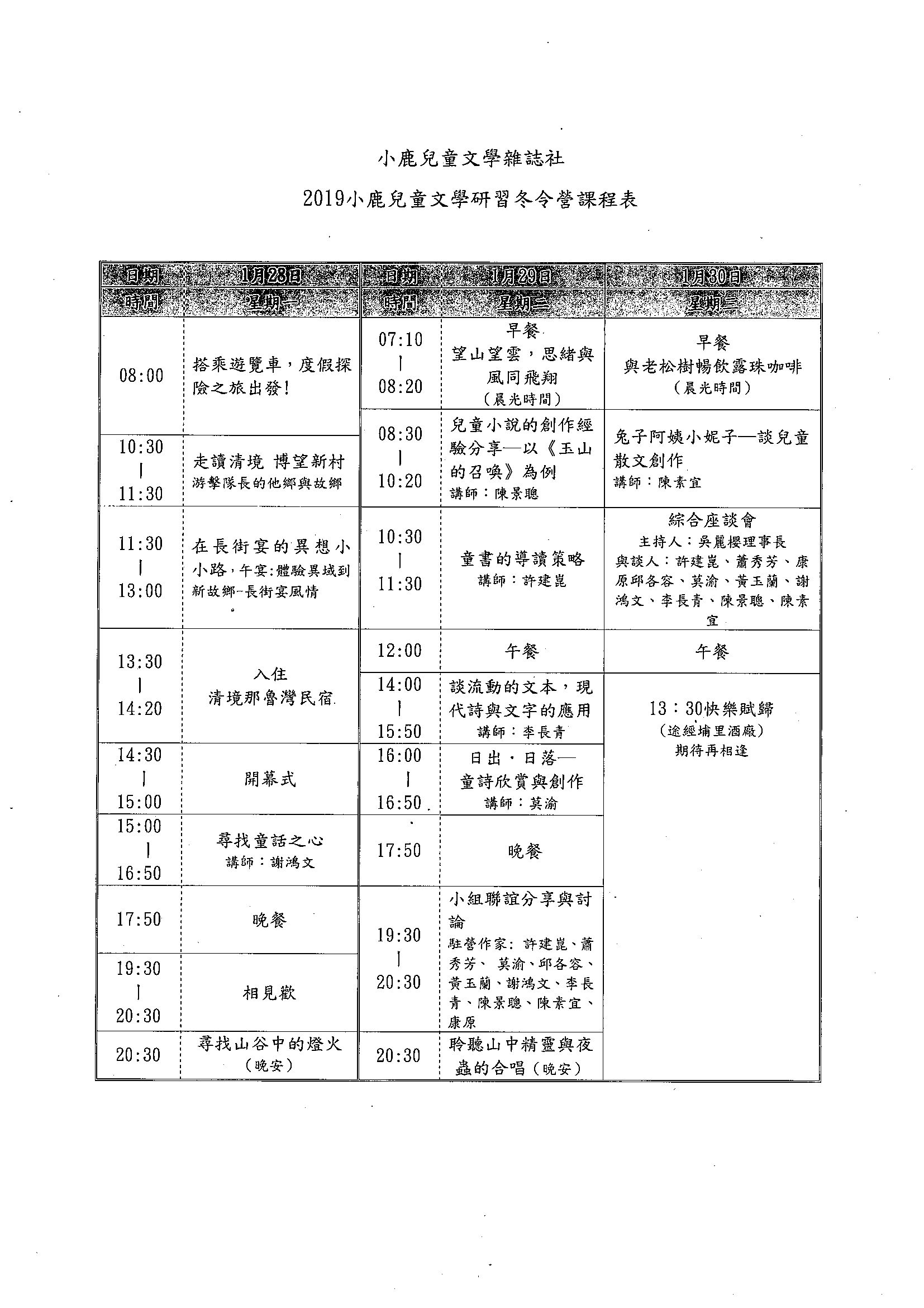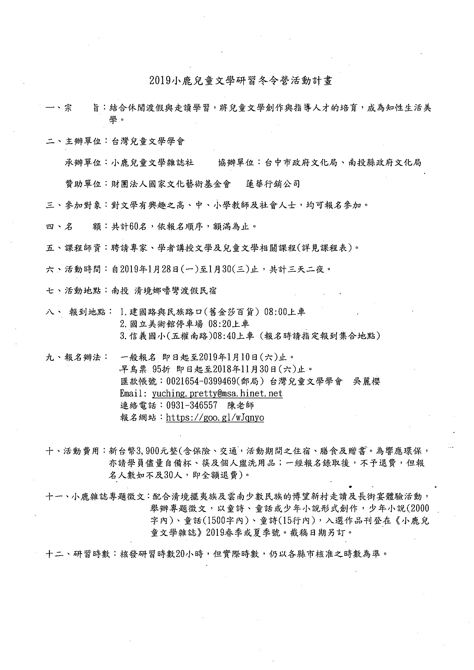 | 2018/11/29 轉知南投縣政府文化局協辦「2019小鹿兒童文學研習冬令營活動計畫」 |