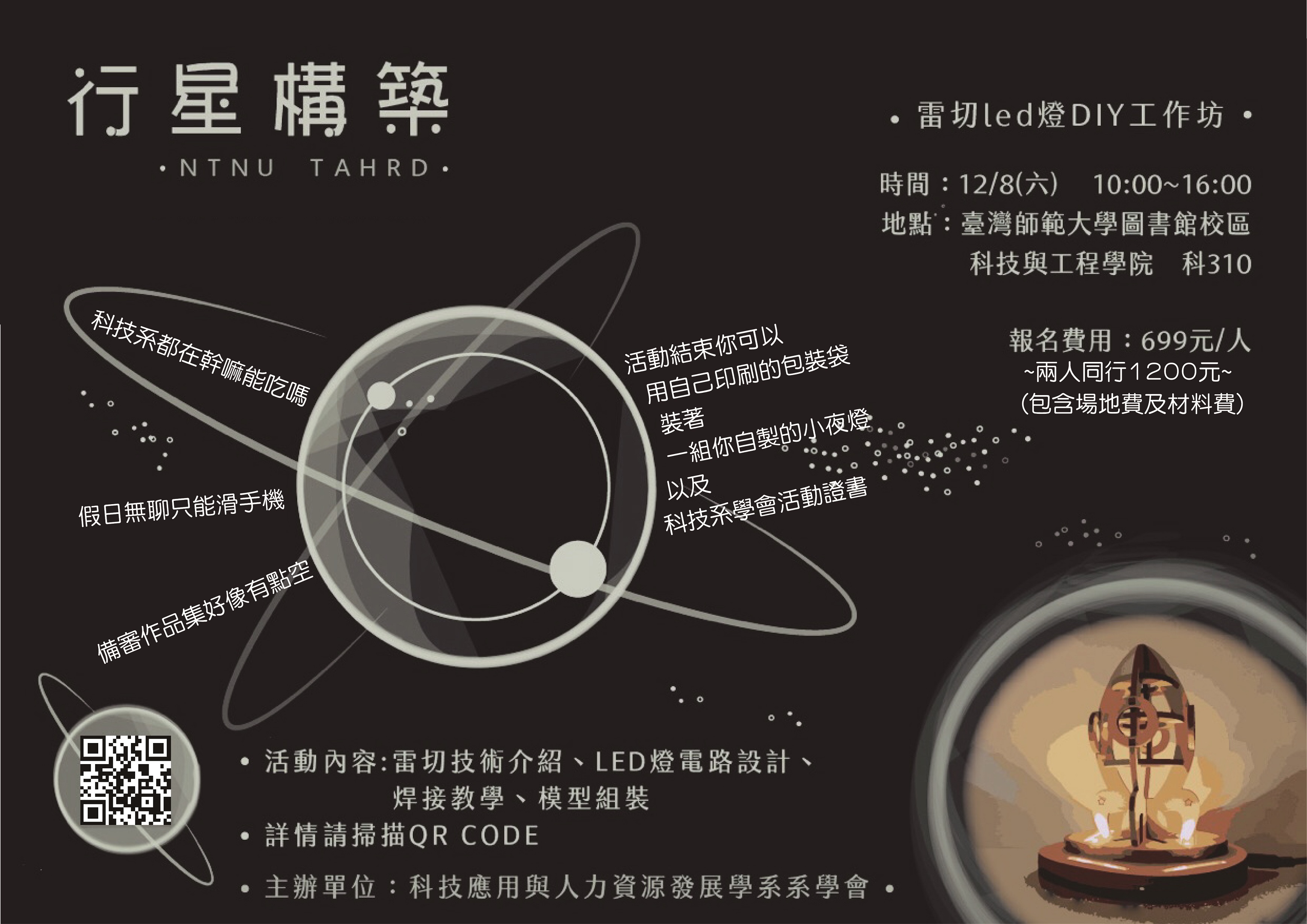 一、謹訂於107年12月8日(星期六)上午10時至下午4時假本校圖書館校區科技與工程學院大樓三樓科310教室舉辦「行星構築-雷切LED燈工作坊」。