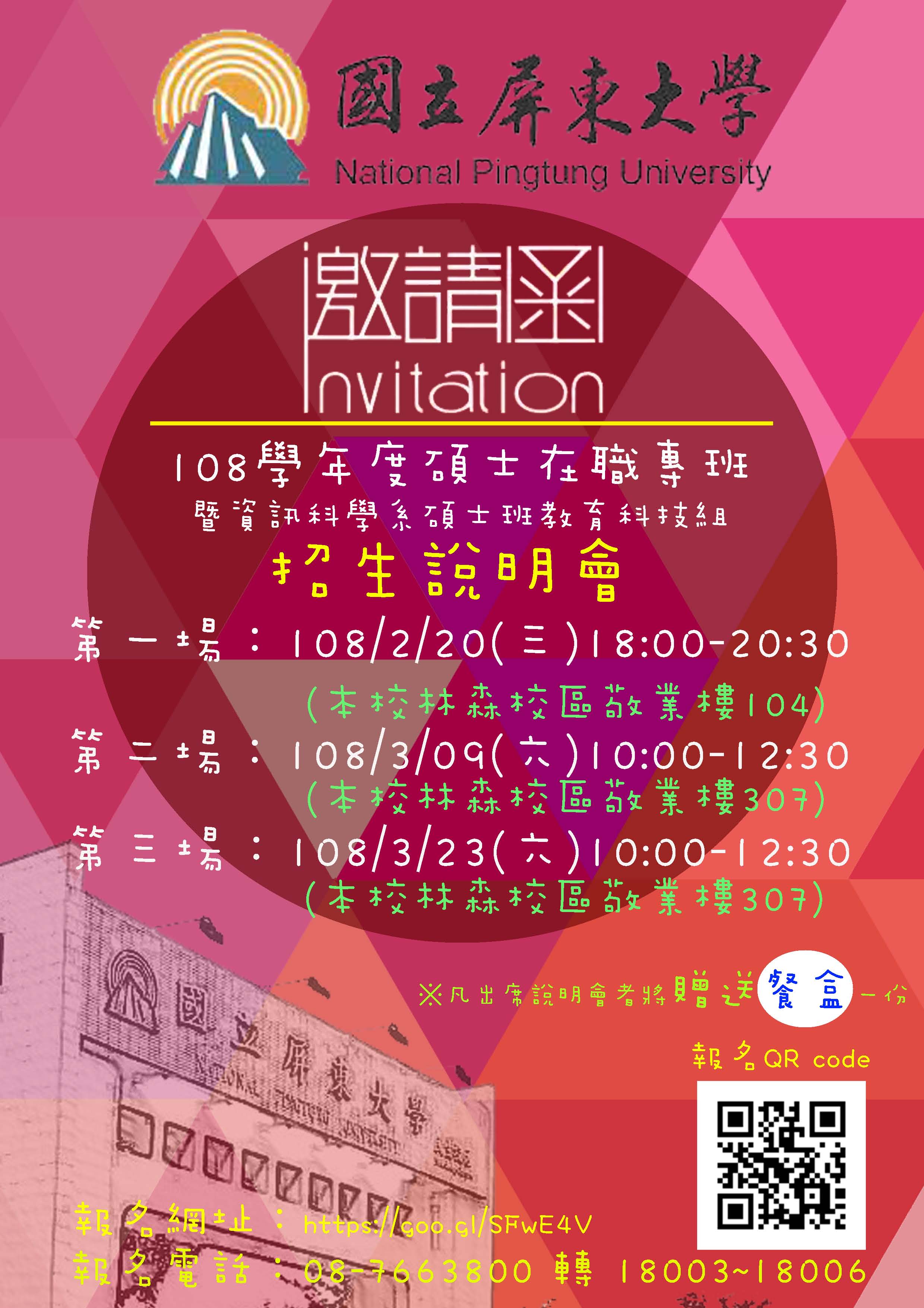 | 2019/01/29 國立屏東大學108學年度碩士在職專班暨資訊科學系碩士班教育科技組入學考試招生訊息 |