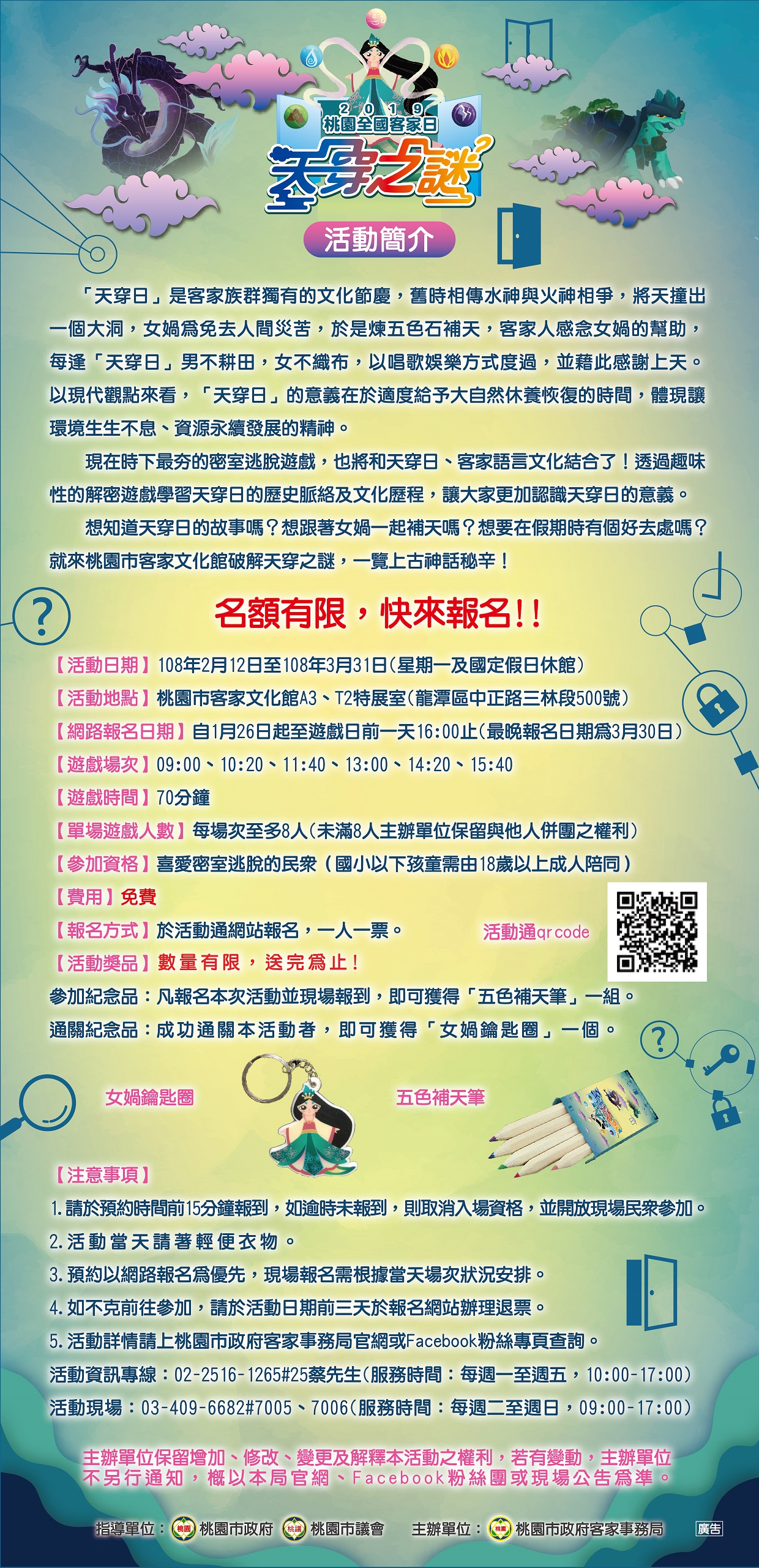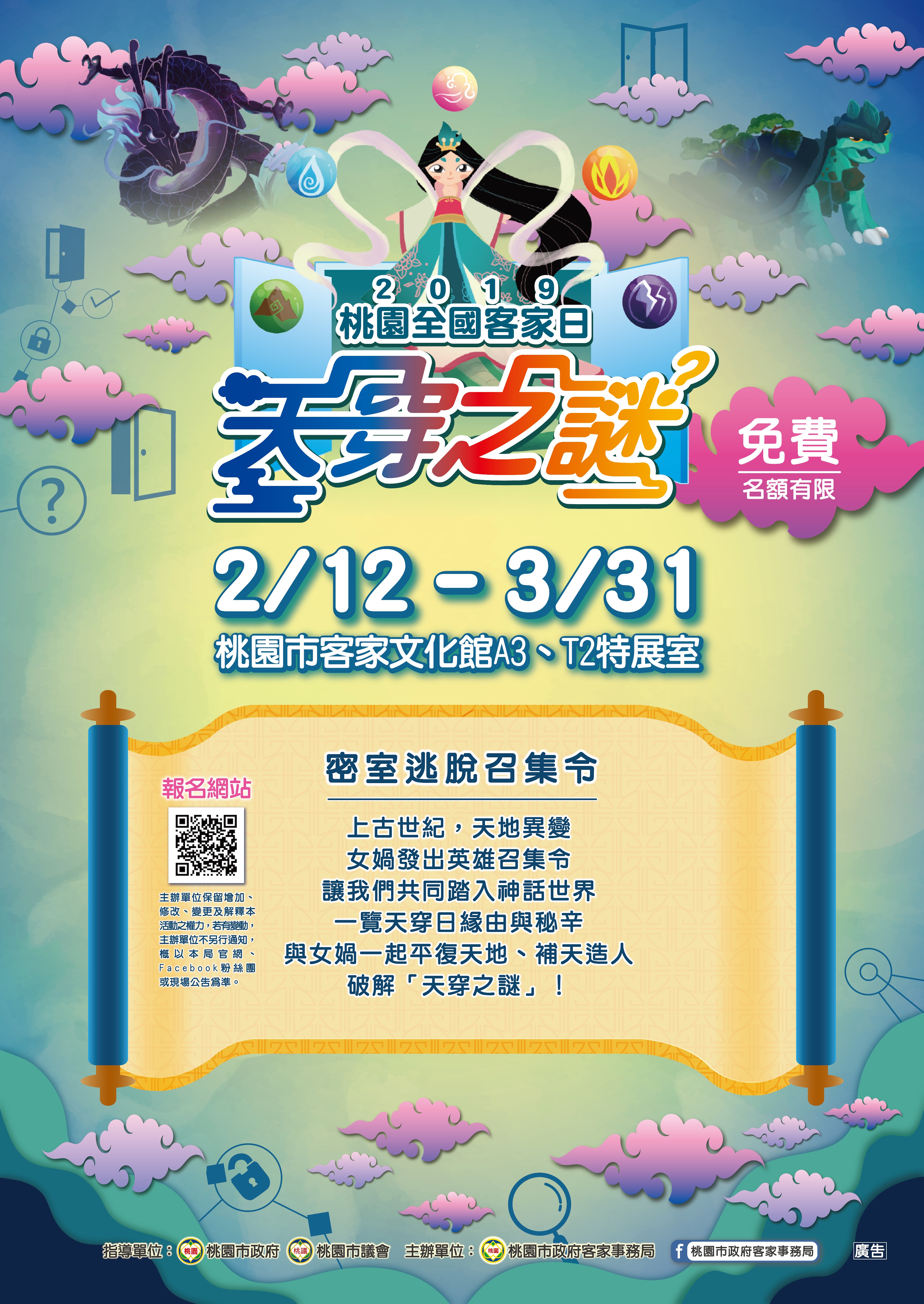 影片連結:https://goo.gl/g9CKwF)及登打宣傳文字「『2019桃園全國客家日─天穿之謎』密室逃脫活動,歡迎免費報名參加!