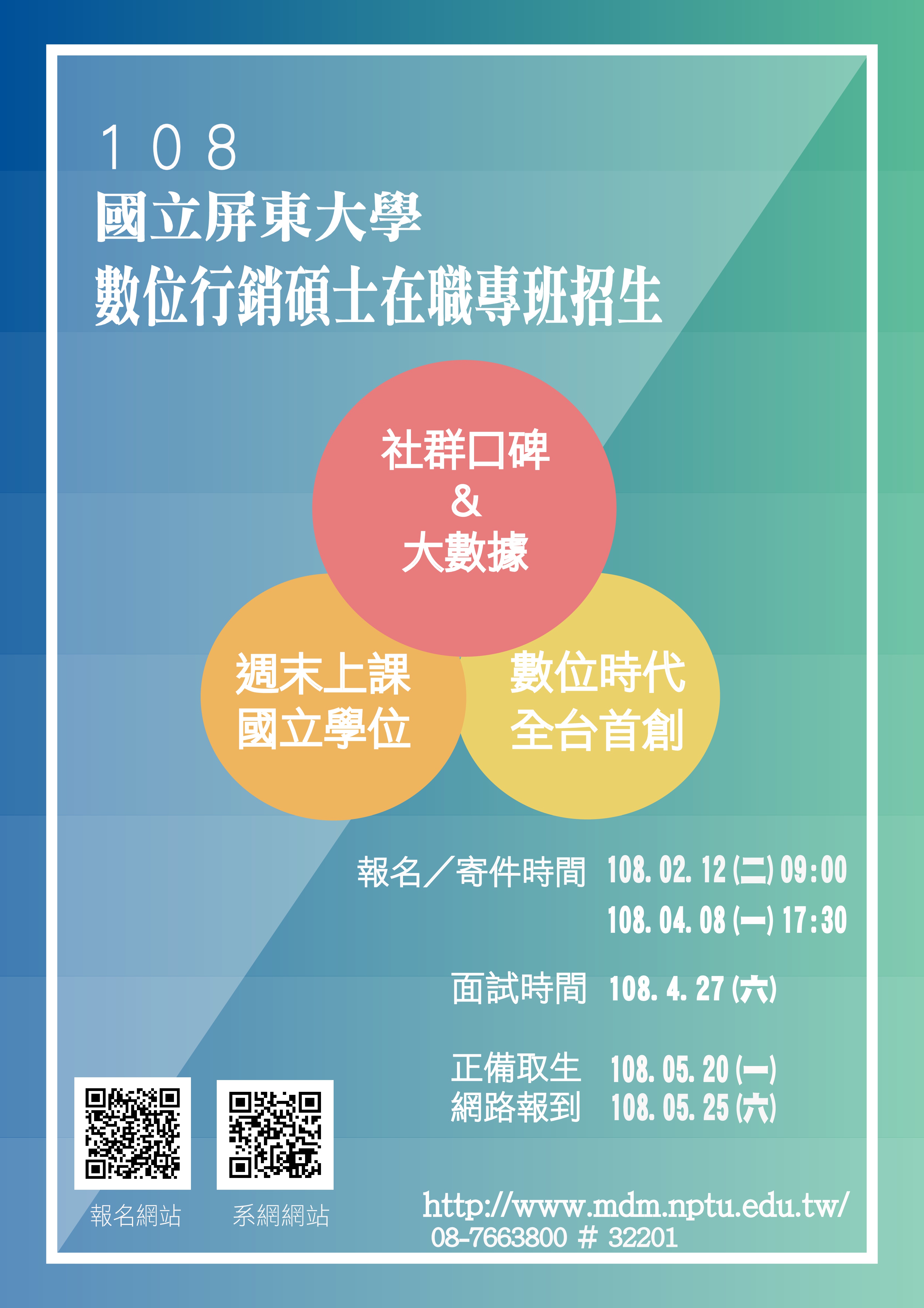 | 2019/02/18 屏東大學行銷與流通管理學系108學年度數位行銷碩士在職專班招生 |
