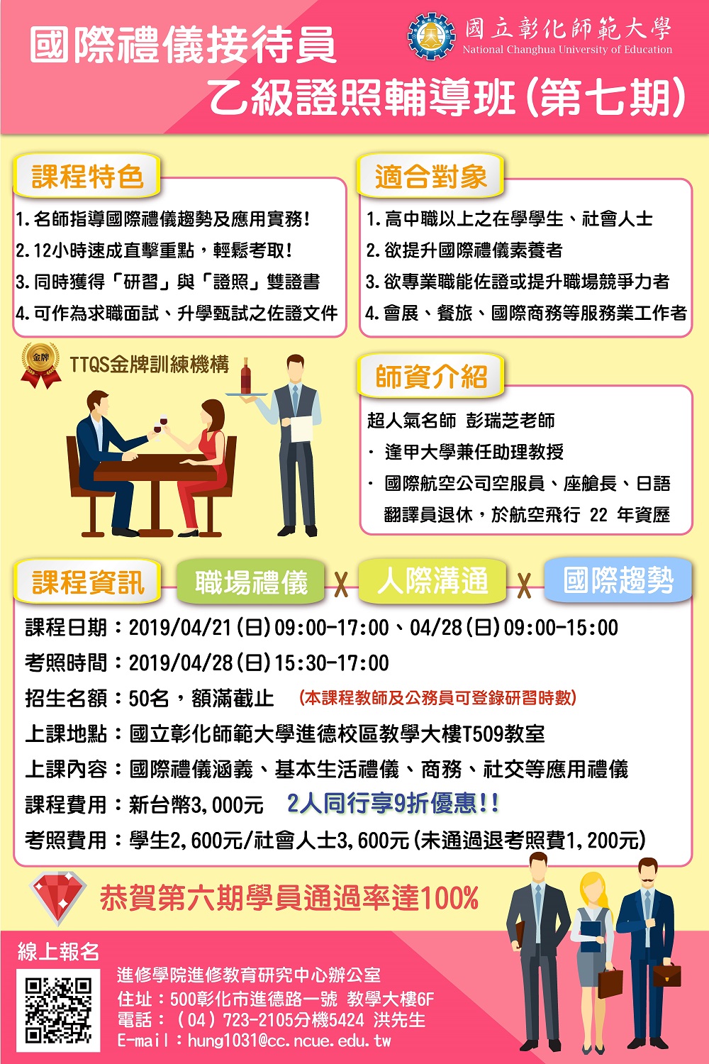 | 2019/02/18 國立彰化師範大學進修學院「第七期國際禮儀接待員乙級證照輔導班」非學分班招生 |