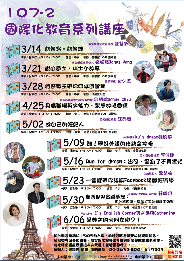 一、本校將於107-2學期舉辦10場「國際化教育系列講座」,並將影片共享至靜宜大學線上開放式課程平台(簡稱:OCW)與各夥伴學校師生共享此學習資源。